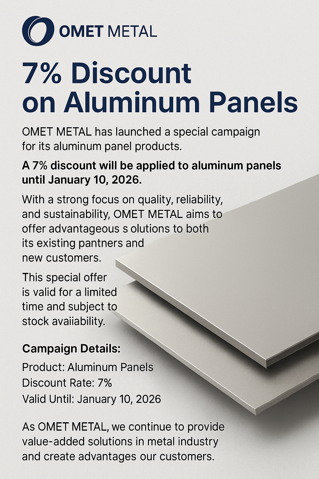 OMET METAL has launched a special campaign for its aluminum panel products. A 7% discount will be applied to aluminum panels until January 10, 2026.